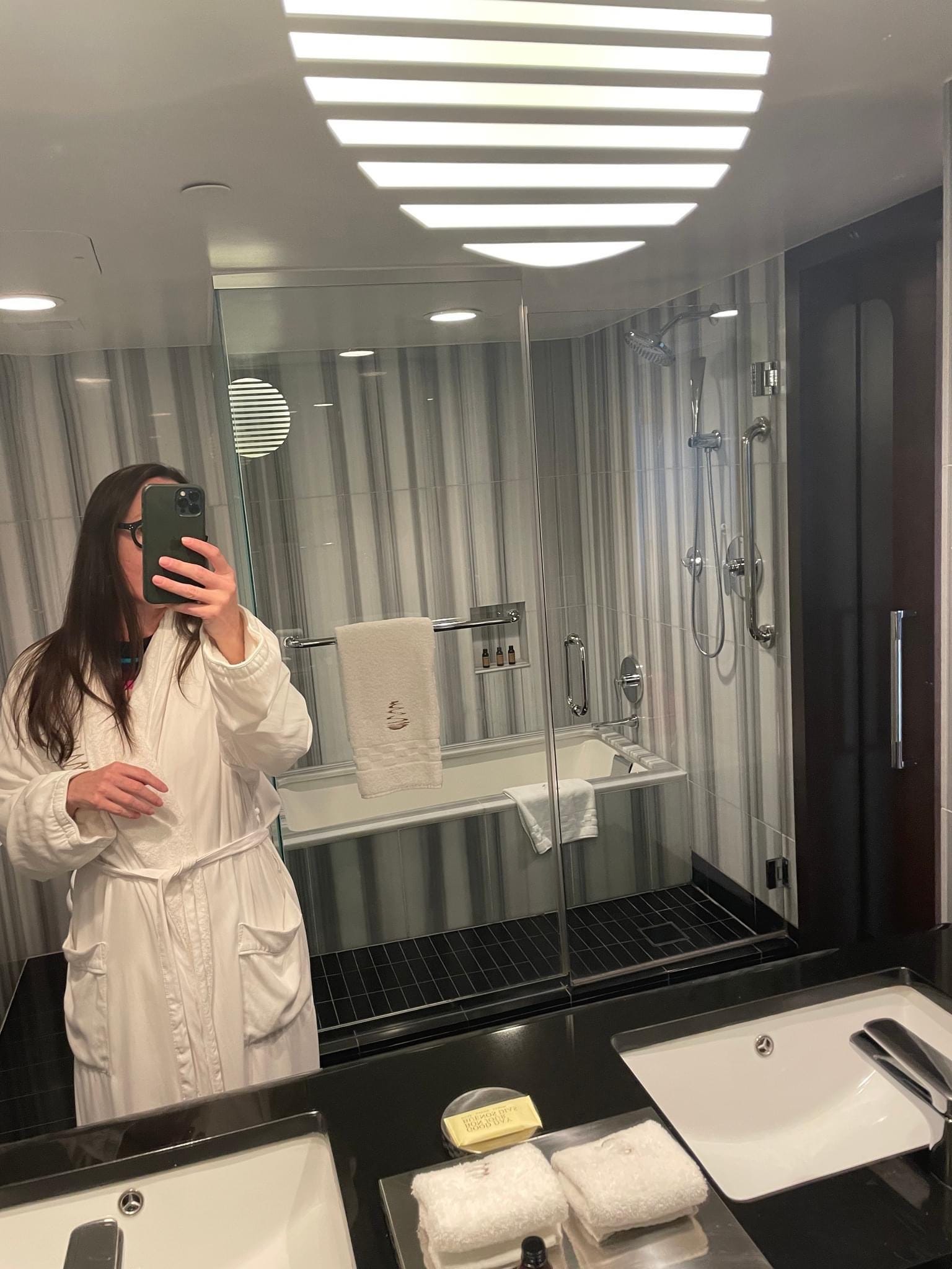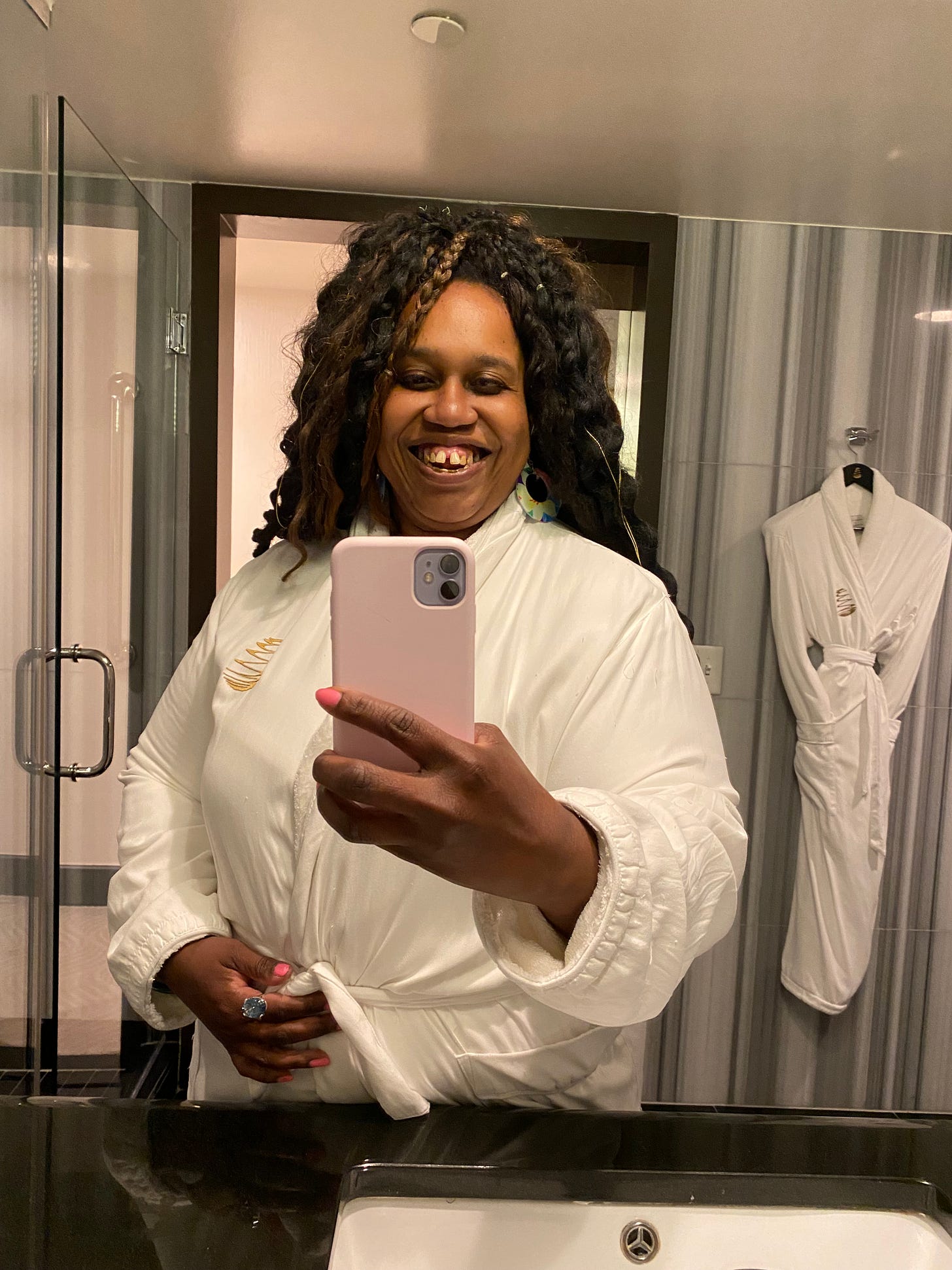 While Tim napped, Emily and I adorned ourselves in the hotel’splush, white robes. We was rich, glamorous women of leisure. Nobody could’ve convinced us otherwise.